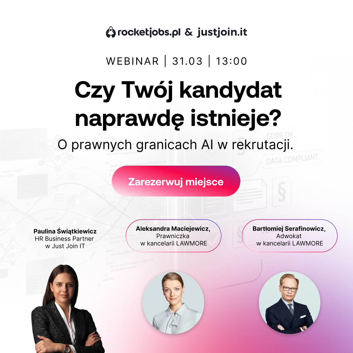 Zachęcamy do zapisów na wydarzenie. Link znajduje się tutaj: Webinar: Czy Twój kandydat naprawdę istnieje? O prawnych granicach AI w rekrutacji | justjoin.it & rocketjobs.pl